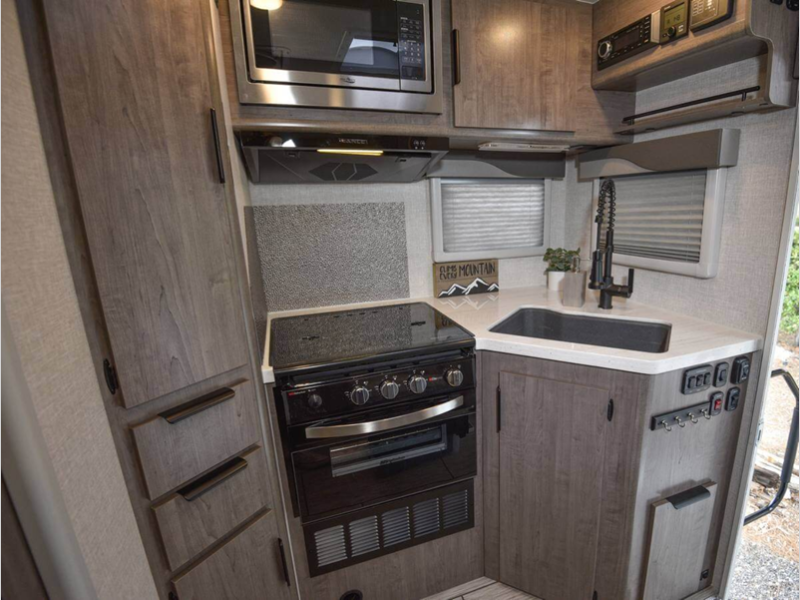 Sleeps 4 Slides 1 Length 18 ft Ext Width 8 ft Ext Height 8 ft 9 in Int Height 6 ft 9 in Interior Color Lapis, Bronzite, Grayson Dry Weight 2857 lbs Fresh Water Capacity 30 gals Grey Water Capacity 20 gals Black Water Capacity 25 gals Available Beds Queen Refrigerator Type Three Way Refrigerator Size 5 cu ft Cooktop Burners 3 Floor Length 8 ft 11 in Wet Weight 3191 lbs Center of Gravity Front 39 in Center of Gravity Rear 39 in LP Tank Capacity 5 gals Water Heater Type Truma Aquago Truck Bed Size Short Number of LP Tanks 2 Body Style Hard-Side Shower Type Wet/Bath Shower -