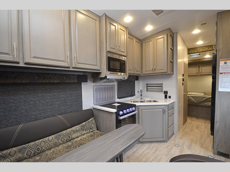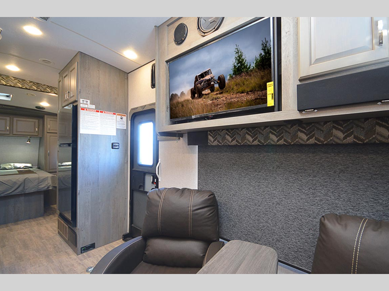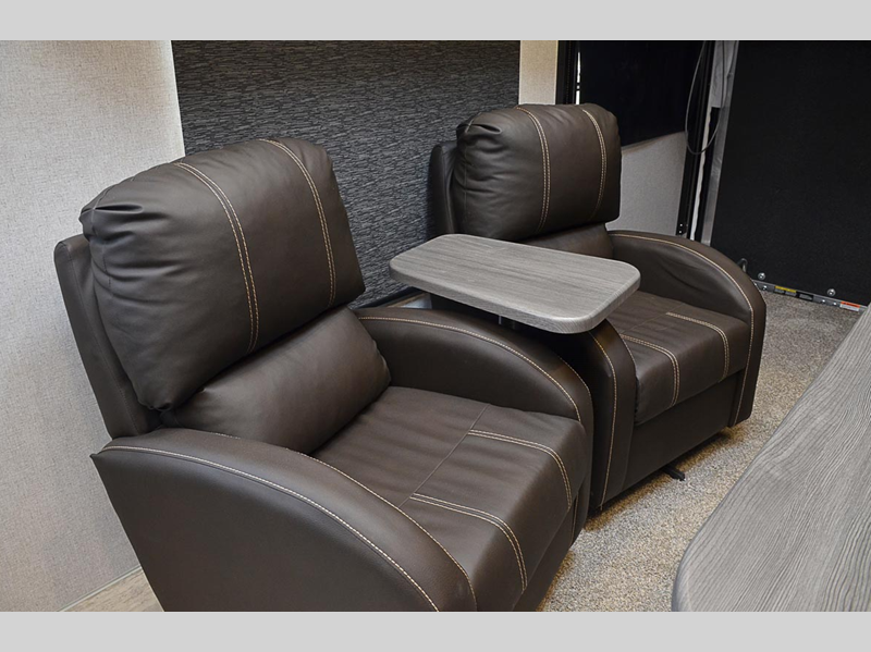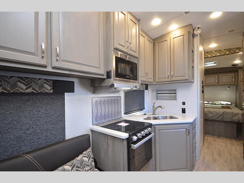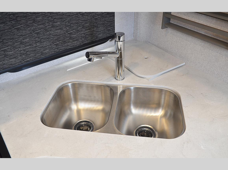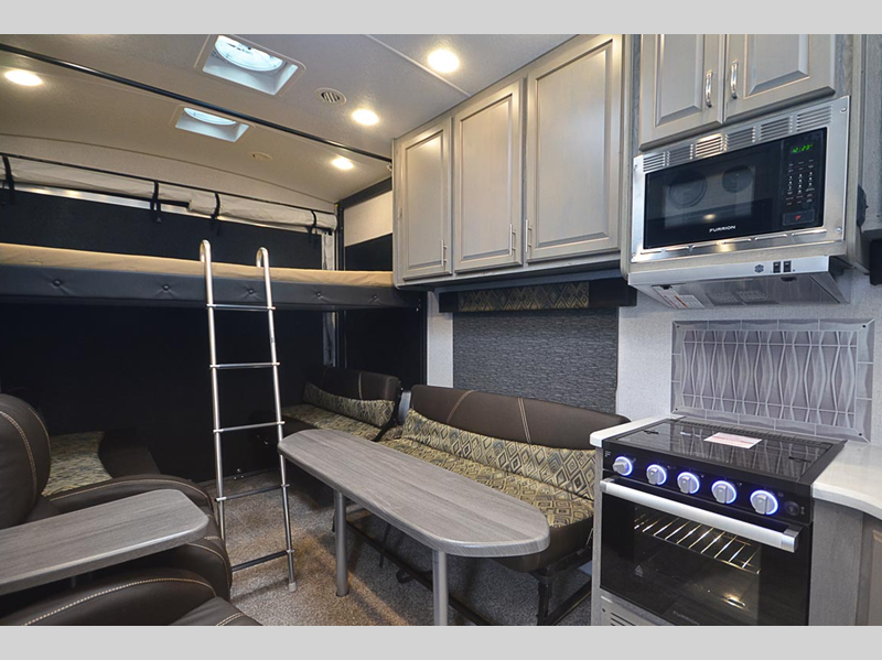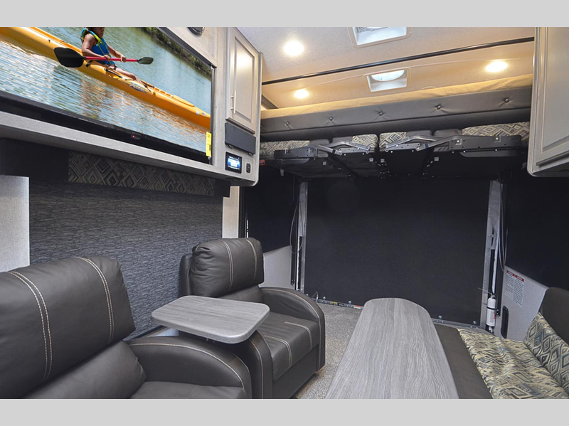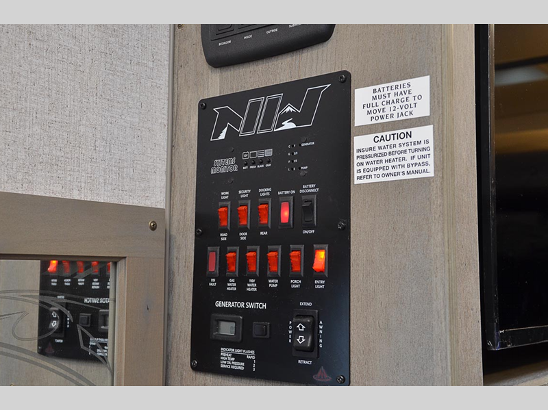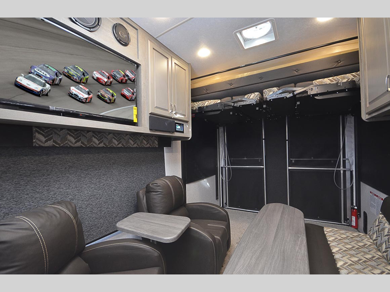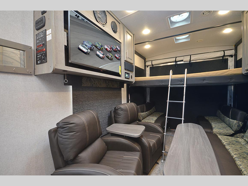 The solid-surface countertops provide lasting quality, and the fiberglass front cap is an aerodynamic and attractive front. You'll be able to use the SolX 4 - 400 Watt solar package and 4.0 Onan gas generator to provide some power, and there is a 40-gallon on-board fuel station to keep your toys full of power too. Use the air compressor when you need to fill up your tires, and spray down your gear with the pressure washer.