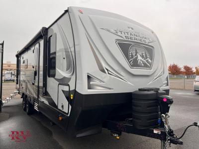With any Black Stone Titanium Series travel trailer by Outdoors RV you will enjoy the sleek design frameless thermal pane windows, along with the silver fiberglass front cap and Titanium Series graphics package. The rugged 8' chassis with 5,200 lb. axles and XL ground clearance will make maneuvering tougher terrain easier than ever, and there is a ground control TT auto leveling system for hassle-free set-up. Each model includes LG solid surface countertops, mountain lodge interiors, hardwood slide out fascia(s), and many more comforts!