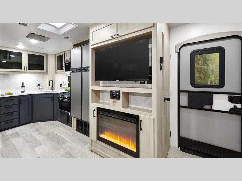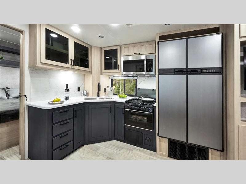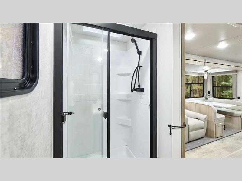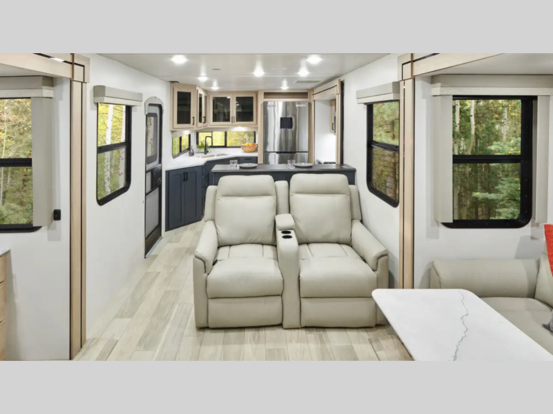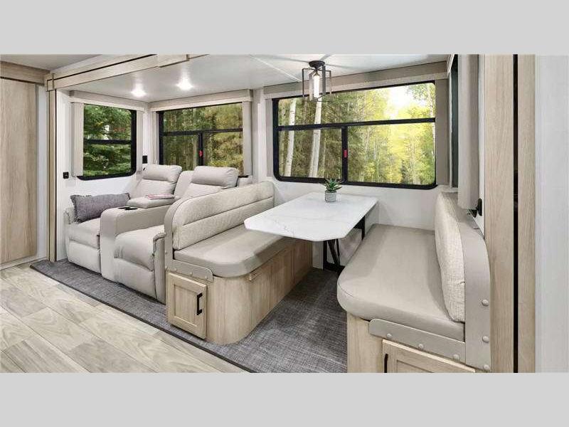 Sleeps 4 Slides 2 Length 36 ft 4 in Ext Width 8 ft Ext Height 11 ft 5 in Int Height 7 ft Interior Color Cobalt Exterior Color White Hitch Weight 914 lbs GVWR 10400 lbs Dry Weight 8386 lbs Fresh Water Capacity 60 gals Grey Water Capacity 98 gals Black Water Capacity 49 gals Tire Size 225/75R15E Furnace BTU 30000 btu Available Beds Queen Refrigerator Type 12V Refrigerator Size 10.3 cu ft Convection Cooking Yes Cooktop Burners 3 Shower Size 30" x 36" Number of Awnings 1 Axle Weight 5200 lbs LP Tank Capacity 30 lbs Water Heater Capacity 10 gal AC BTU 15000 btu TV Info LR Smart TV Awning Info 13' Electric w/LED Lighting Axle Count 2 Washer/Dryer Available Yes Number of LP Tanks 2 Shower Type Standard Electrical Service 50 amp Similar Floorplans