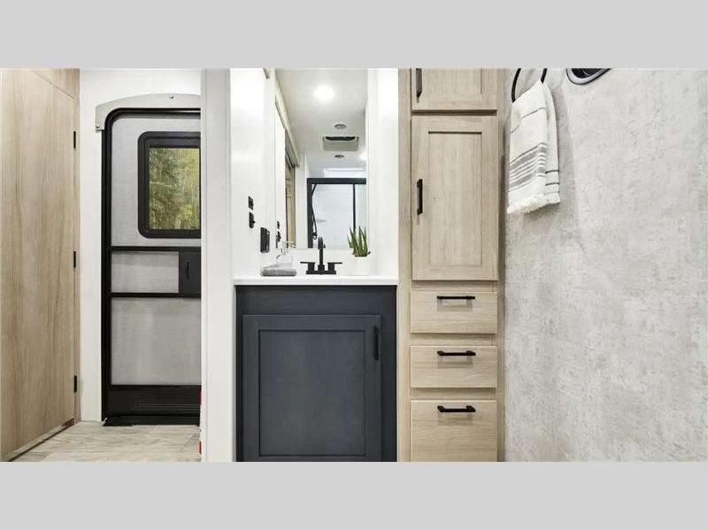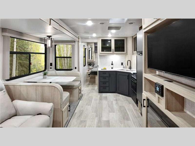Sleeps 5 Slides 1 Length 31 ft 8 in Ext Width 8 ft Ext Height 11 ft 5 in Int Height 7 ft Interior Color Cobalt Exterior Color White Hitch Weight 840 lbs GVWR 10400 lbs Dry Weight 7444 lbs Fresh Water Capacity 60 gals Grey Water Capacity 98 gals Black Water Capacity 49 gals Tire Size 225/75R15E Furnace BTU 30000 btu Available Beds Queen Refrigerator Type 12V Refrigerator Size 15 cu ft Convection Cooking Yes Cooktop Burners 3 Shower Size 30" x 36" Number of Awnings 1 Axle Weight 5200 lbs LP Tank Capacity 30 lbs Water Heater Capacity 10 gal AC BTU 15000 btu TV Info LR Smart TV Awning Info 18' Electric w/LED Lighting Axle Count 2 Number of LP Tanks 2 Shower Type Standard Electrical Service 50 amp Similar Floorplans